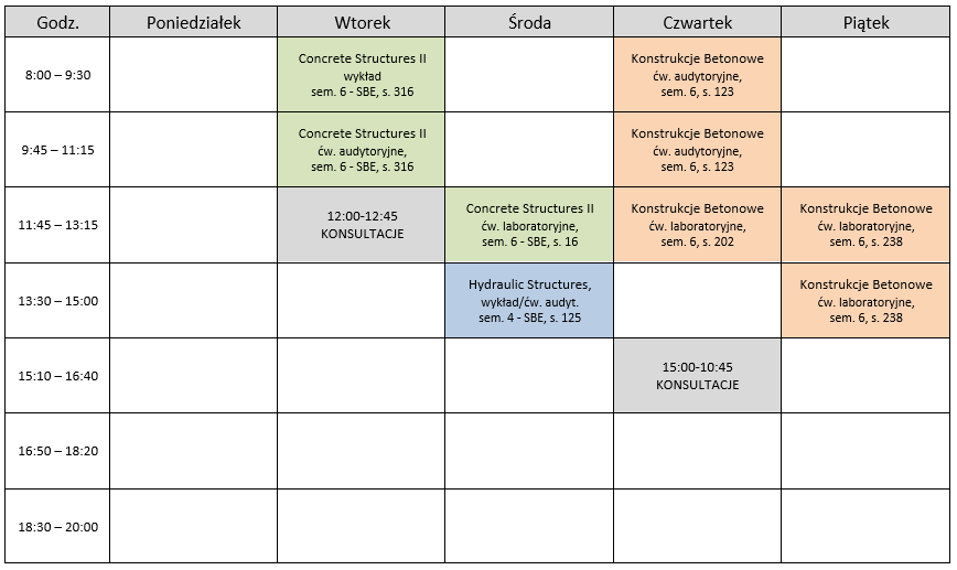 Ćwiczenia audytoryjne i projektowe na kierunku Structural Engineering studiów stacjonarnych II stopnia (prowadzone w j. angielskim).